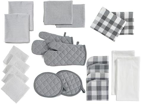 20-Piece Kitchen Marvel: Get more for less with our 20-piece set! Includes 6 kitchen towels cotton (16″x28″), 4 terry dish cloth (12″x12″), 4 dish scrubbers for washing dishes (12”x12”) 2 flour sack dish towels for kitchen (28”x28”), 2 Pot Holders, 2 Oven Mits. All 100% cotton – soft, durable, and ready to tackle any kitchen task!